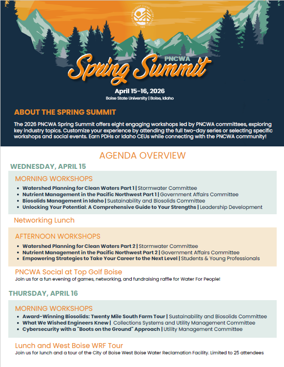 Come together this April with 170+ clean water enthusiasts for two days of engaging workshops, inspiring speeches, and connective networking. Dive into peer conversations, and practical takeaways you can apply right away. Customize your experience by attending the full two-day series or selecting specific workshops and social events. Earn CEUs or PDHs while connecting with the PNCWA community!